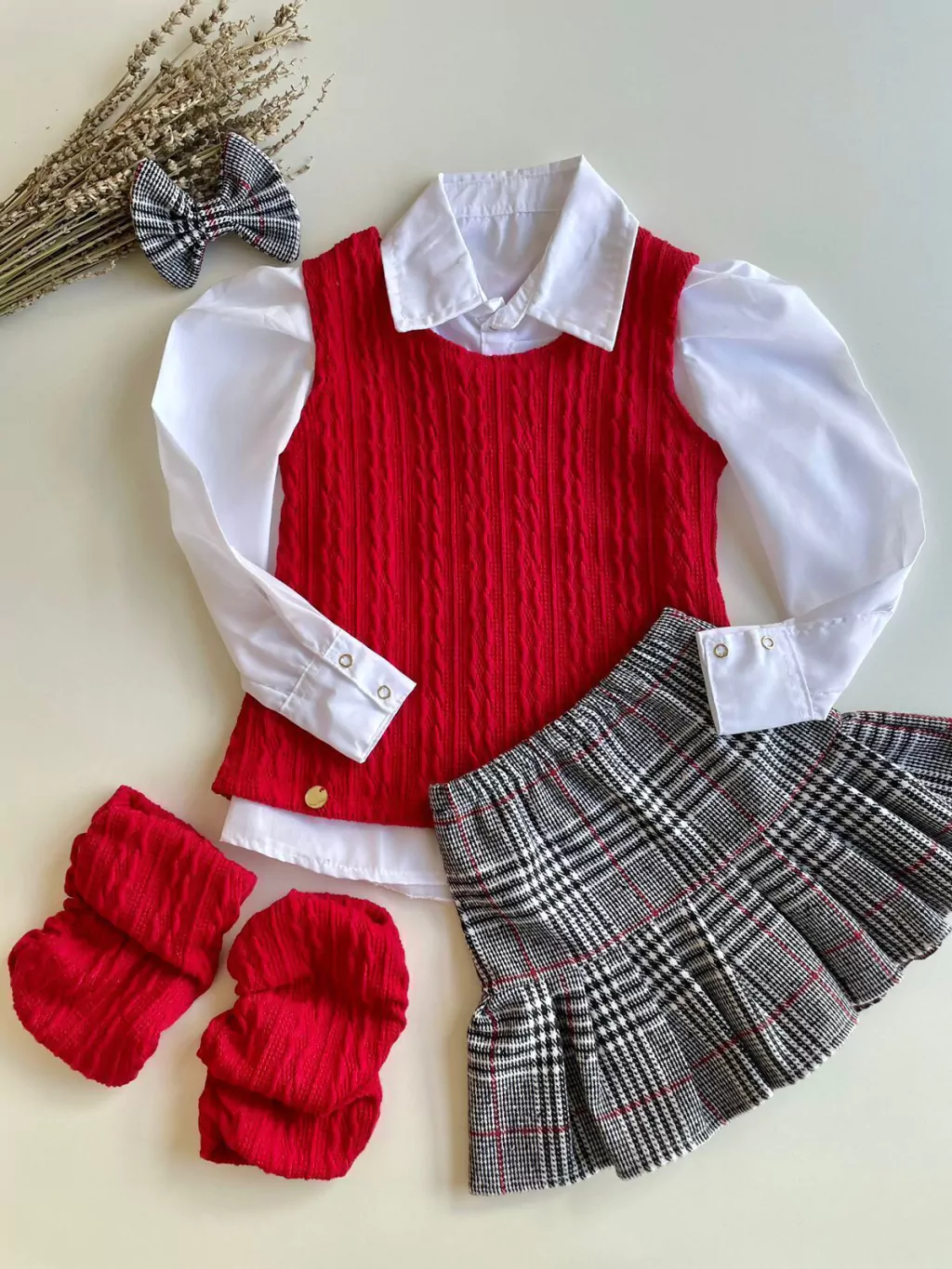 Conjunto 4 Peças - Blusa Vermelha Tricô + Camisa Branca + Saia Xadrez + Laço de Cabelo