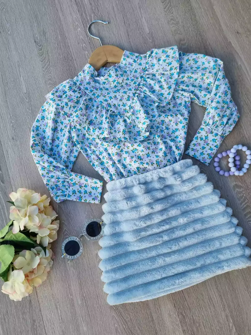 Conjunto Azul Blusa Floral Babado e Saia Pelinho Ondulado
